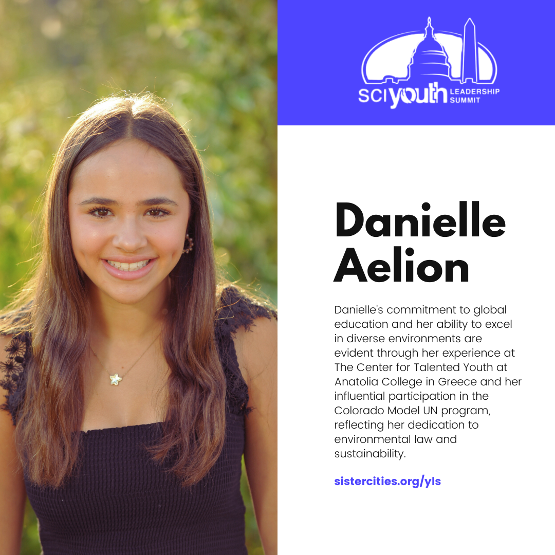 Danielle Aelion: Danielle's participation in the Youth Leadership Summit was a natural extension of her commitment to global education and sustainability. Having attended The Center for Talented Youth (CTY) at Anatolia College in Greece through Johns Hopkins University, Danielle brought a wealth of experience to the summit. Her contributions to the Colorado Model UN Program and her keen interest in environmental law were evident as she navigated complex debates on international cooperation and climate change. Danielle’s ability to thrive in diverse settings underscores her future as a potential leader in global environmental initiatives.