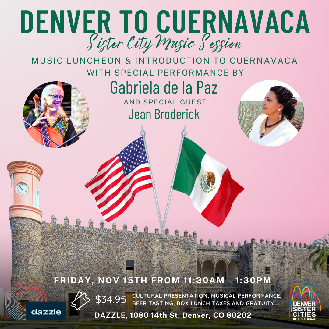This month’s Sister City Music Luncheon shines a spotlight on the Cuernavaca Committee’s recent impactful projects, including tree planting, a sports event at Parque Denver in Cuernavaca, and the transformative eyeglasses campaign that provided vision care to over 600 residents—all thanks to the incredible dedication of our volunteers. 🎵 Special Guests: Gabriela de la Paz, a celebrated Mexican singer, will bring the beauty of Latin American songs to life, accompanied by Colorado cellist Jean Broderick. Together, they’ll create a vibrant, cross-cultural musical experience you won’t want to miss!